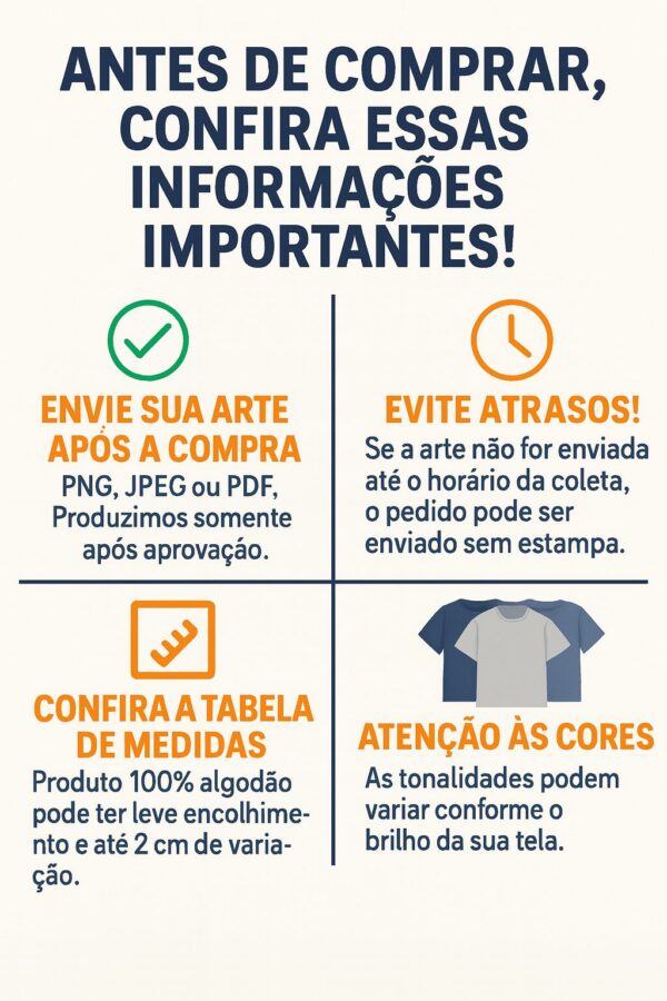 Após finalizar a compra, entre em contato pelo chat ou WhatsApp e envie sua estampa (imagem, frase, logo ou nome). Aceitamos arquivos em PNG, JPEG ou PDF.